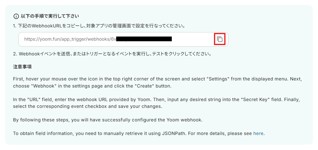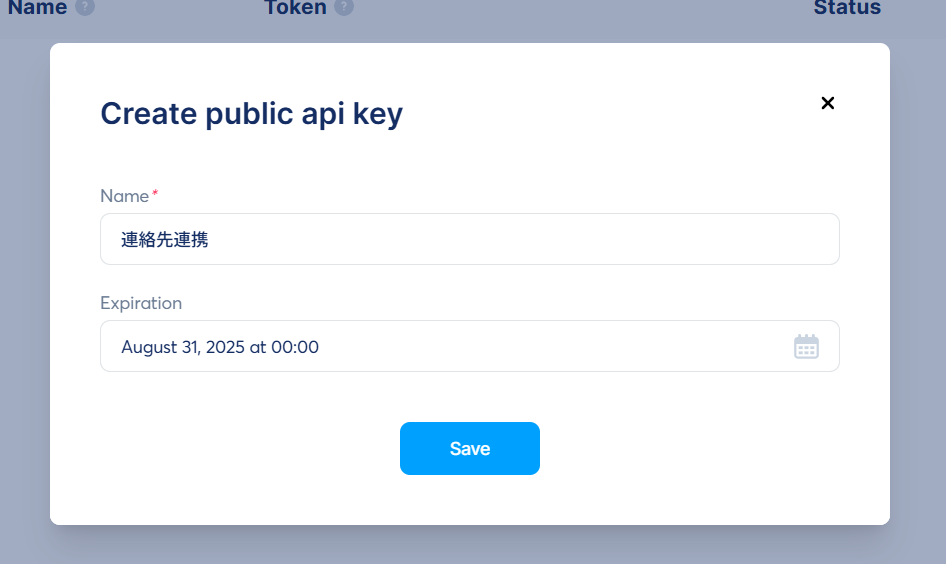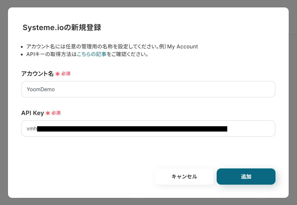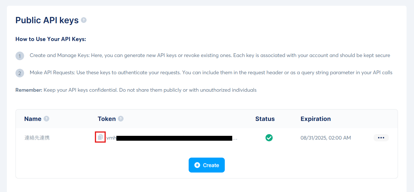 - 生成されたAPI Keyをコピーし、Yoomの連携画面の「API Key」に設定。