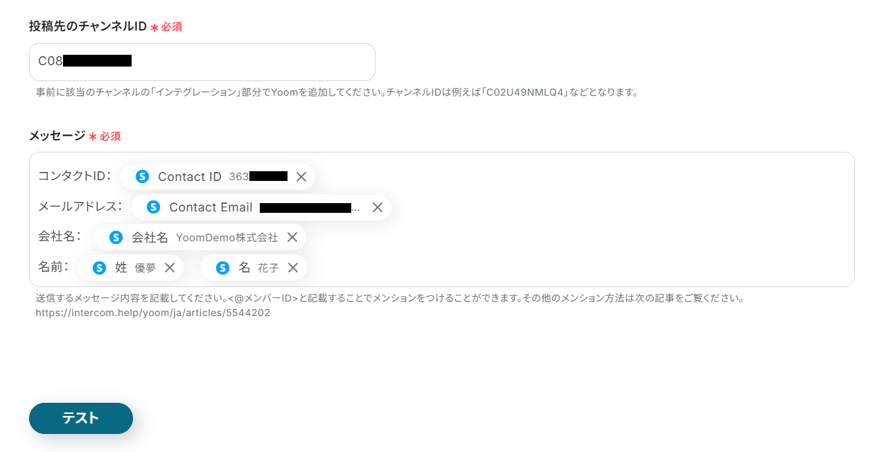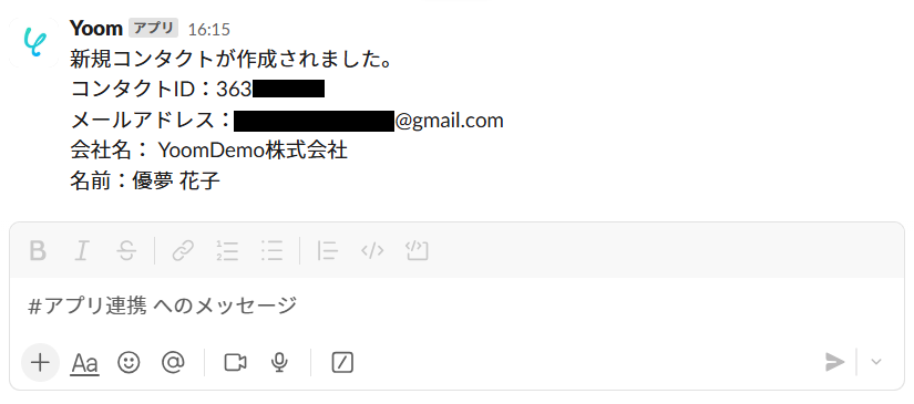 - テストに成功すると、指定したチャンネルに連絡先情報が投稿されます。
