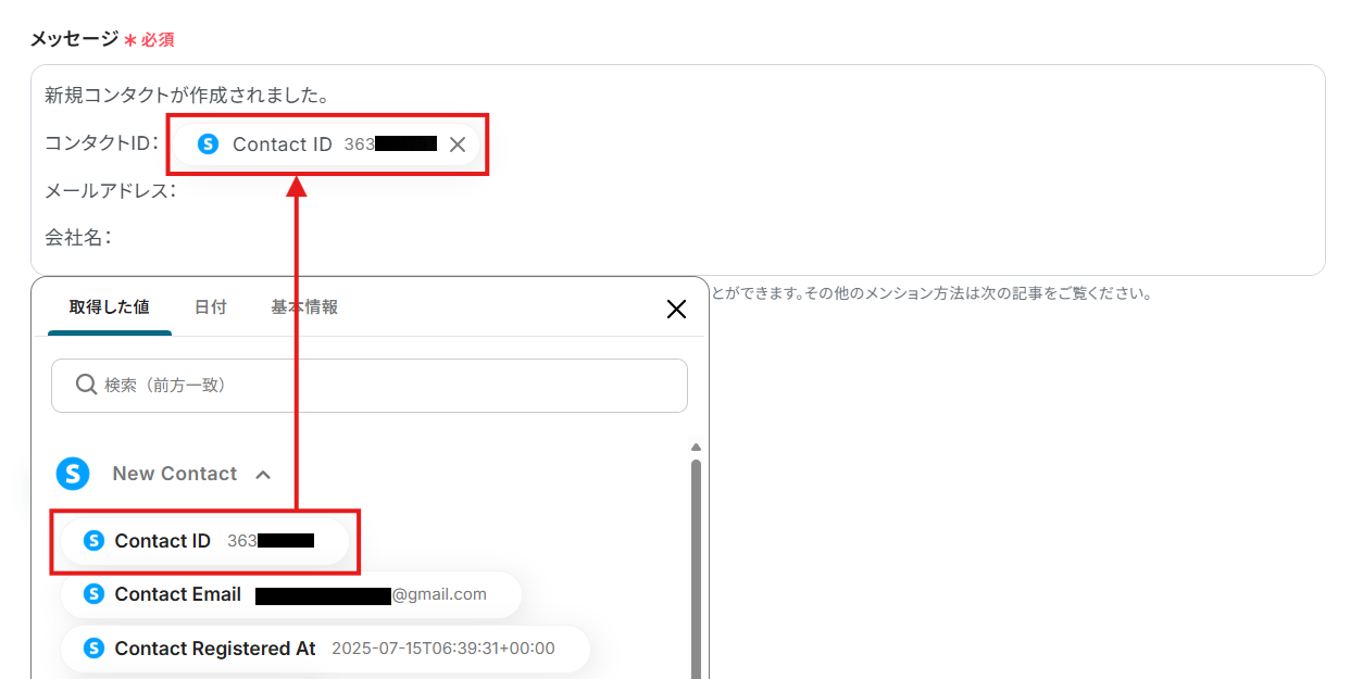 入力欄クリック時に表示されるトリガーアクションメニューから、ステップ3で取得したコンタクト情報を選択できます。