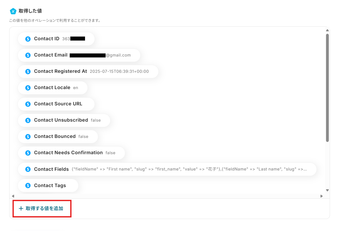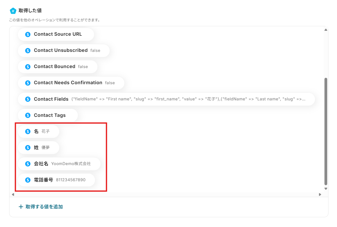 これらの値を以降のアクションで変数として使用するには、「取得する値を追加」をクリックして、連絡先の各項目を追加する必要があります。