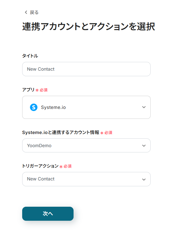 - 連携アカウントとトリガーアクションを確認し、「次へ」をクリック。
