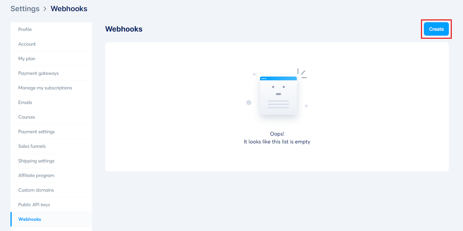 右上のユーザーアイコンから「Settings」にアクセスし、「Webhooks」の「Create」をクリック。