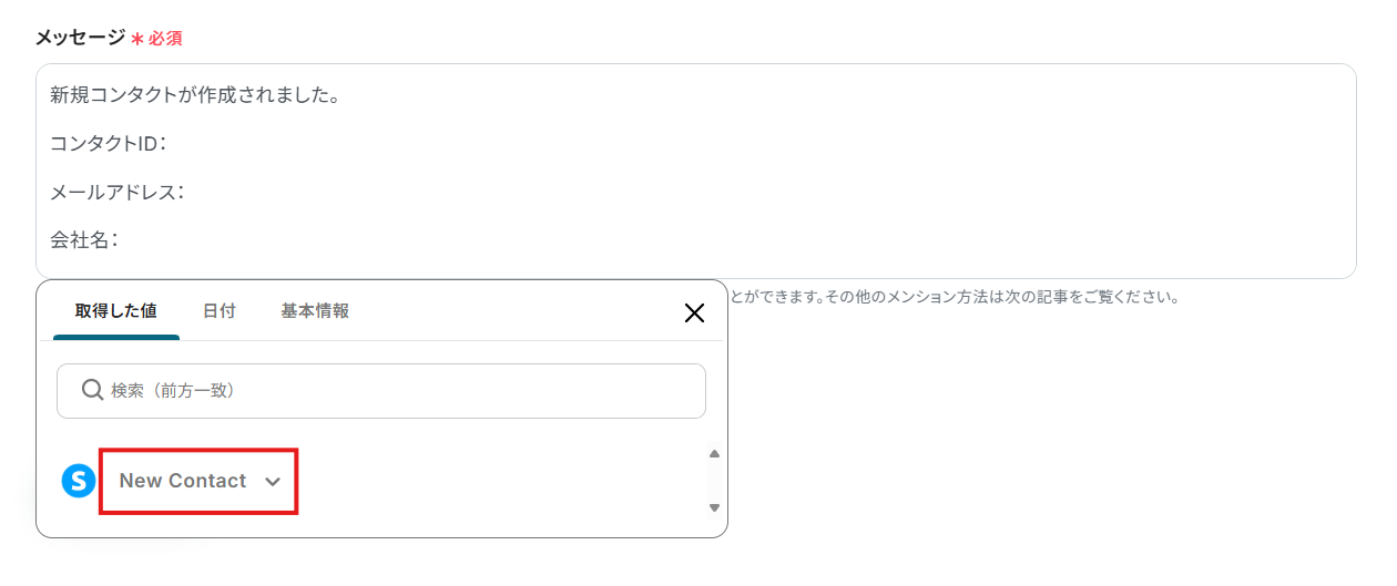 これらの値を用いて、作成されたコンタクトを通知するメッセージを設定しましょう。