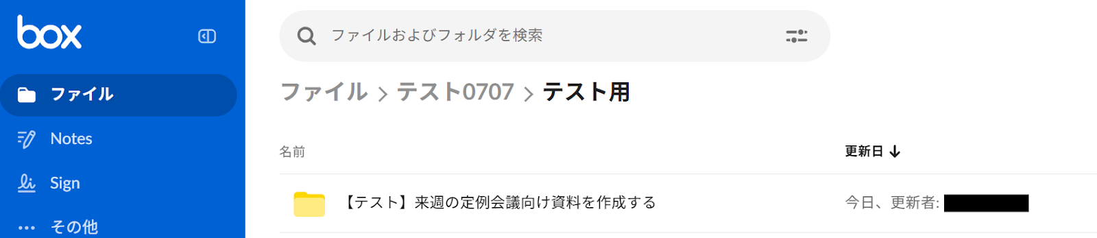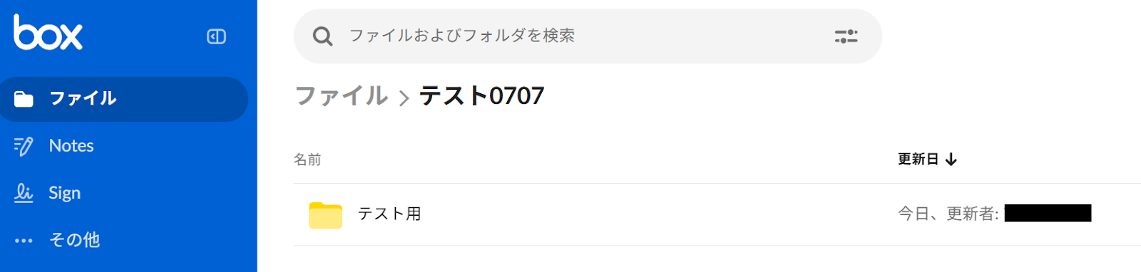 テスト後は、Boxの画面できちんとファイルが作成されているか確認しておくと安心です。
