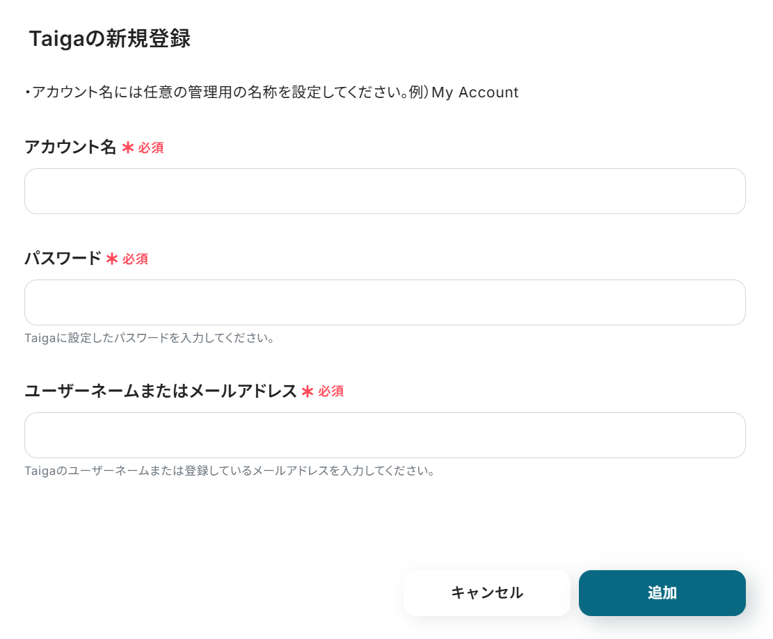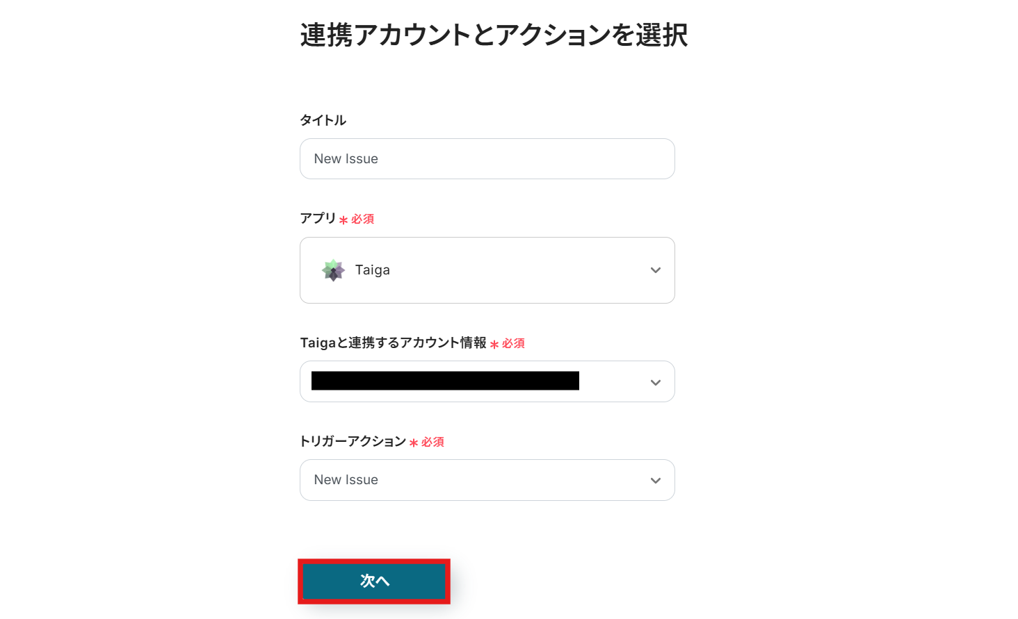 Taigaと連携するアカウント情報はプルダウンから選択します。