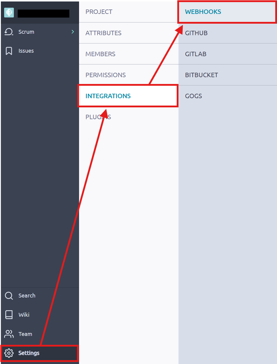 Taigaの画面でSettingからINTEGRATIONS→WEBHOOKSに進みます。