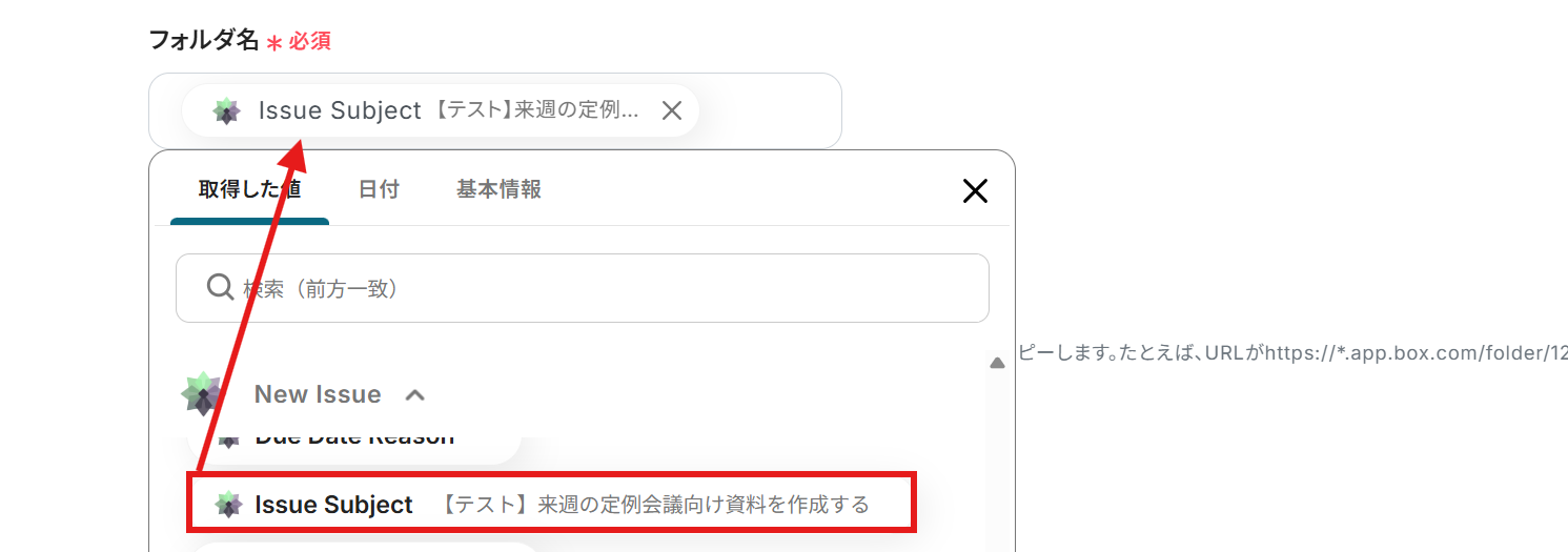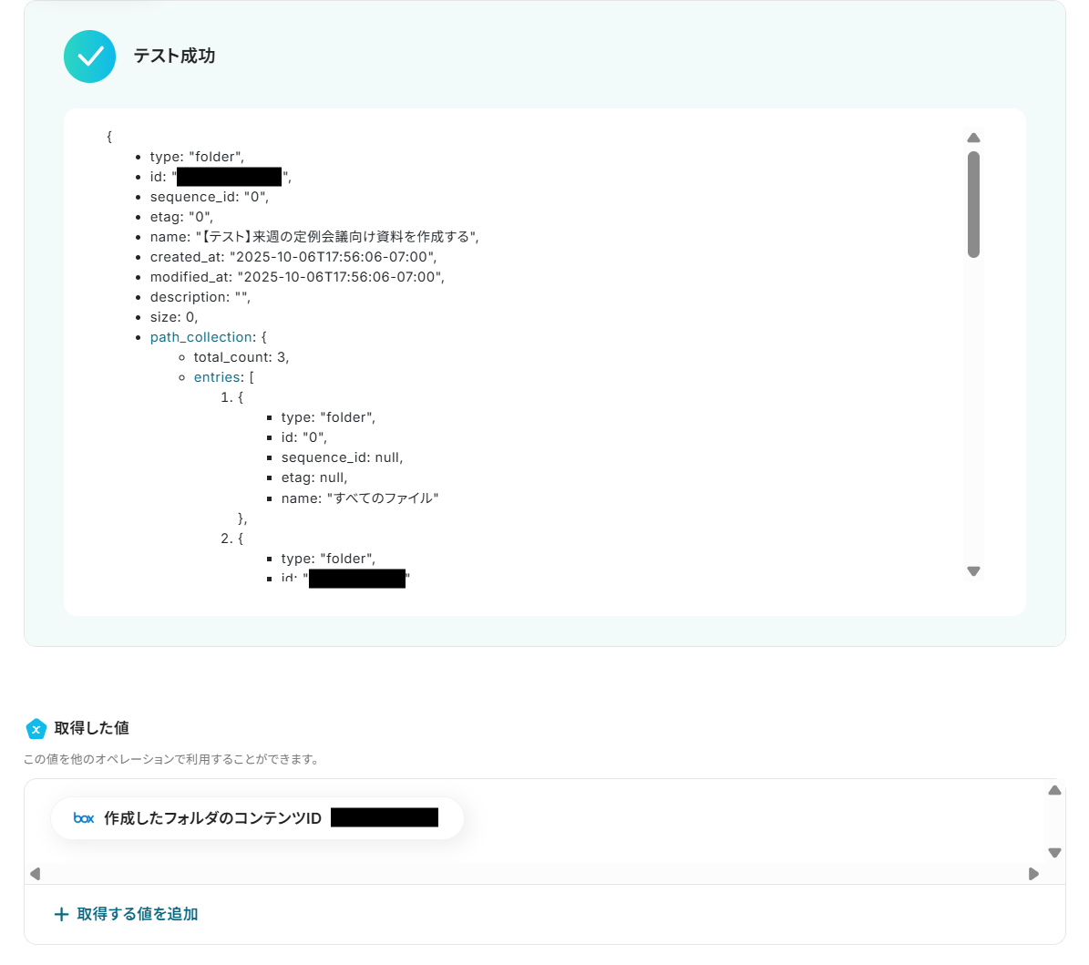 ※テキストを直接入力した部分は固定値となります。全て手入力をしてしまうと、同じフォルダ名のフォルダが重複してBoxに登録されてしまいます。IDなど変化する部分は取得した値を引用して設定するようにしましょう。