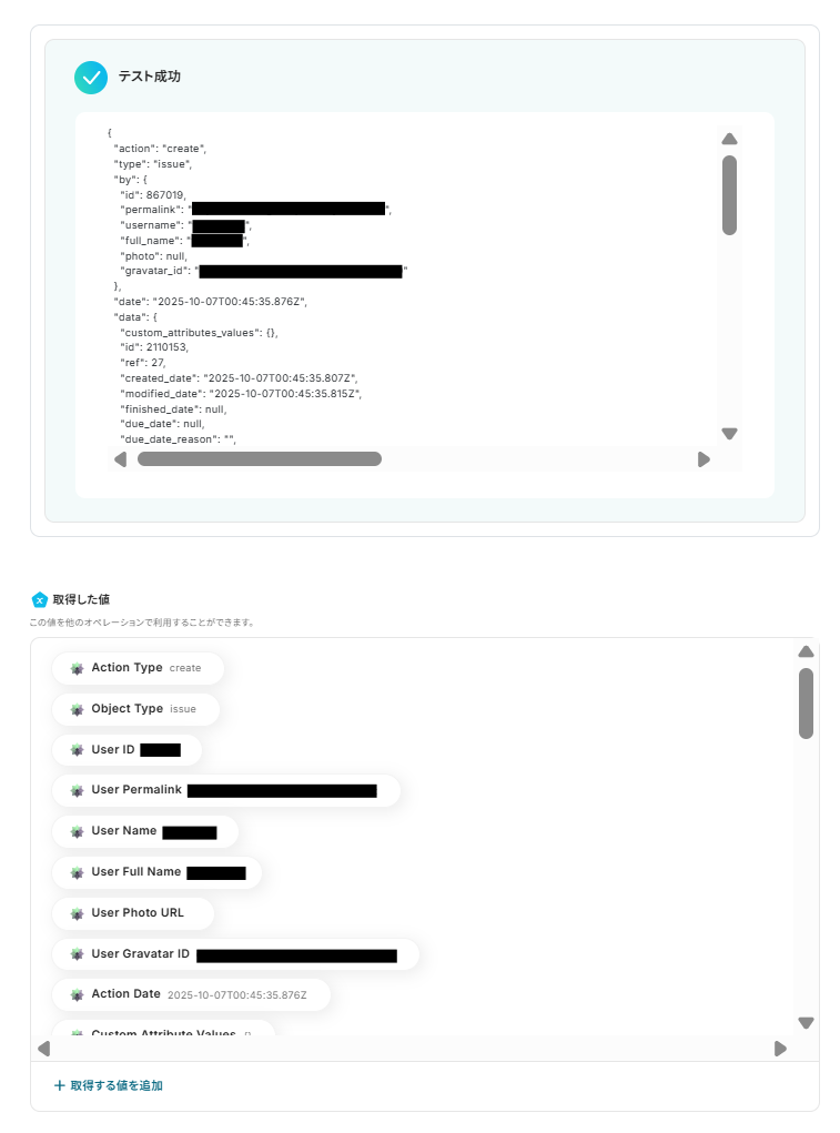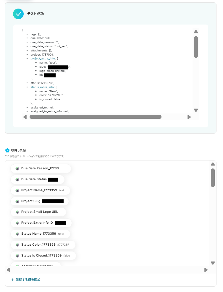 テストが成功すると、「テスト成功」という画面が表示され、Taigaから取得した値を確認できます。