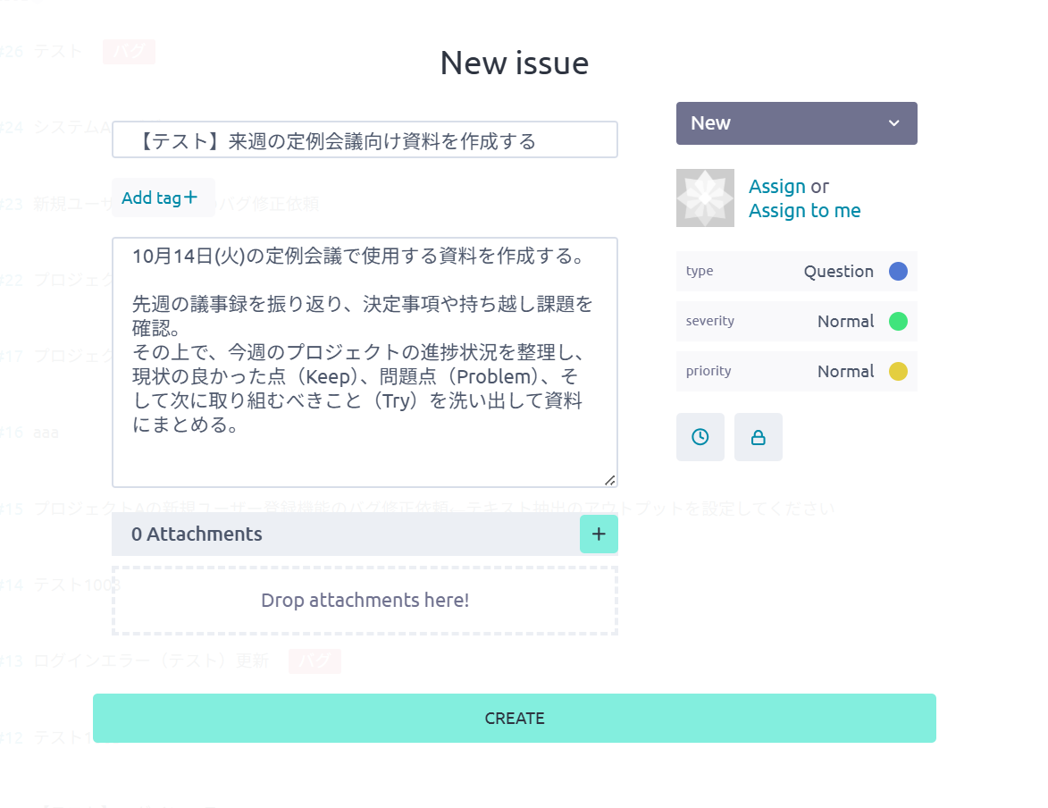 Webhookの設定が終わったらテストのため、TaigaでIssueを作成しましょう!