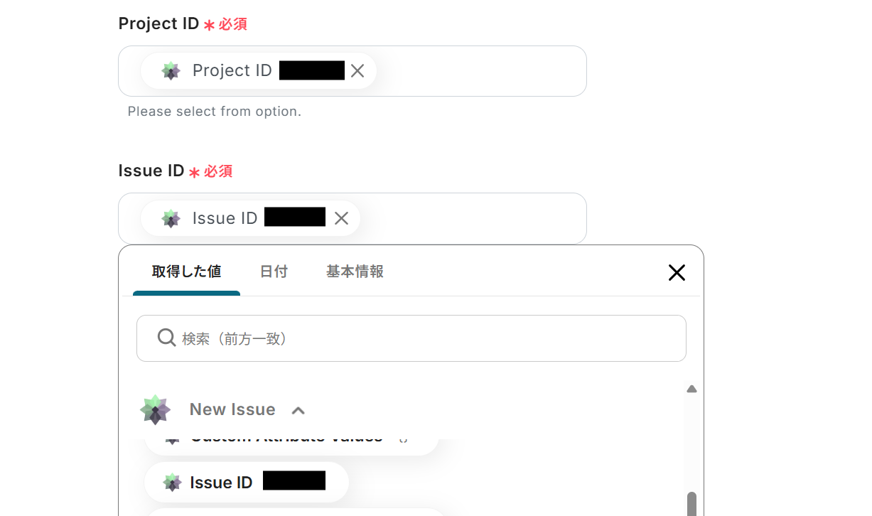 Project ID・Issue ID:入力欄をクリックすると、TaigaでIssueを作成した際に取得したIDを引用できるので、その中から選択しましょう。