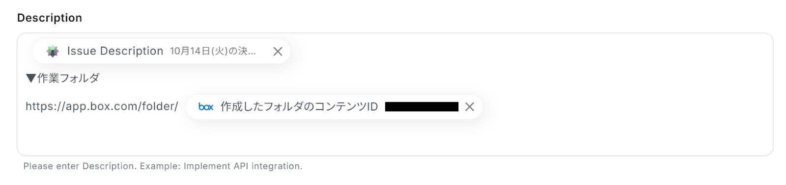 今回は、TaigaのDescriptionにBoxのフォルダのリンクを追加したいので、Descriptionの項目に以下のように設定しました。
