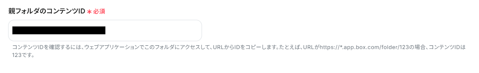 親フォルダのコンテンツID:対象のフォルダIDをここに入力してください。IDはBoxで該当フォルダにアクセスし、URLをコピーすれば取得できます。たとえばURLが「https://.app.box.com/folder/789」であれば、「789」がコンテンツIDです。より詳しい手順は、Boxの公式ヘルプ記事(コンテンツIDの確認方法)を参照にしてみてくださいね。