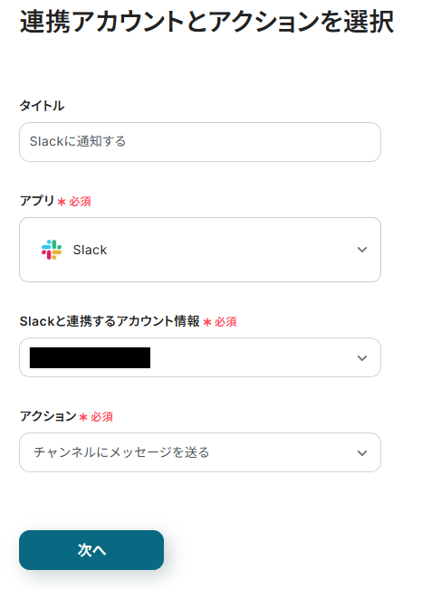 タイトルと連携するアカウント情報を任意で設定し、アクションはテンプレート通りに「チャンネルにメッセージを送る」のまま「次へ」をクリックして進んでください。