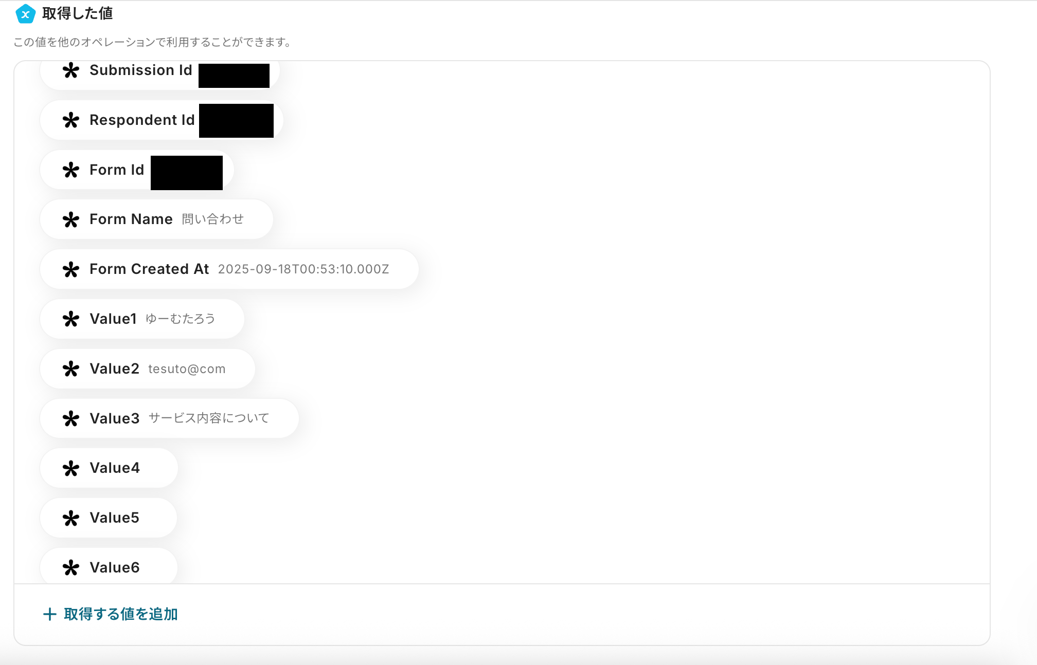 次にYoomに戻りテストボタンをクリックしてください。テストが成功したら、取得した値にTallyの回答データが追加されます。