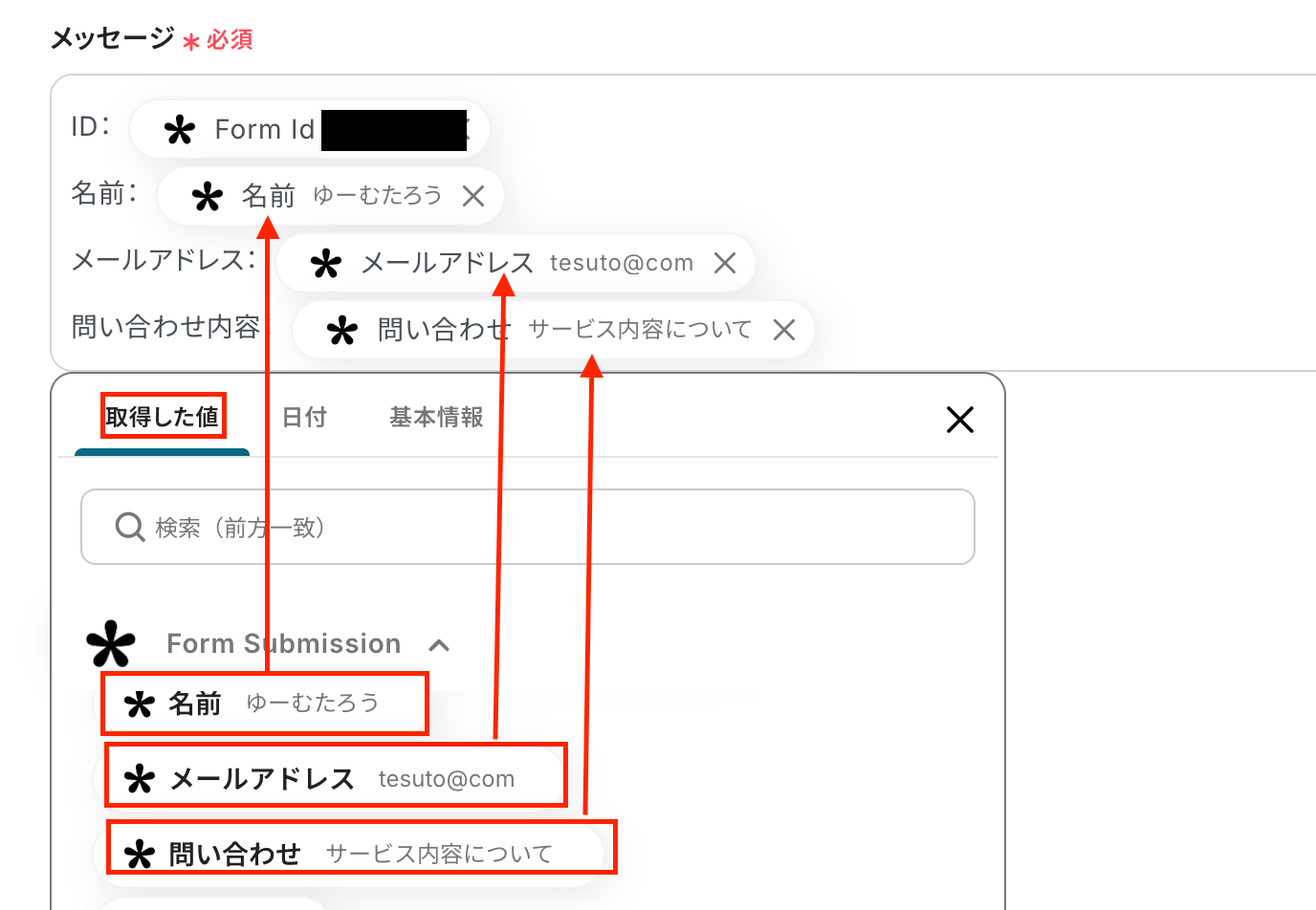 取得した値を活用せずに直接テキストを直接入力した箇所は固定値になります。同じ内容が繰り返しLINE公式アカウントで通知されることになるので注意しましょう。