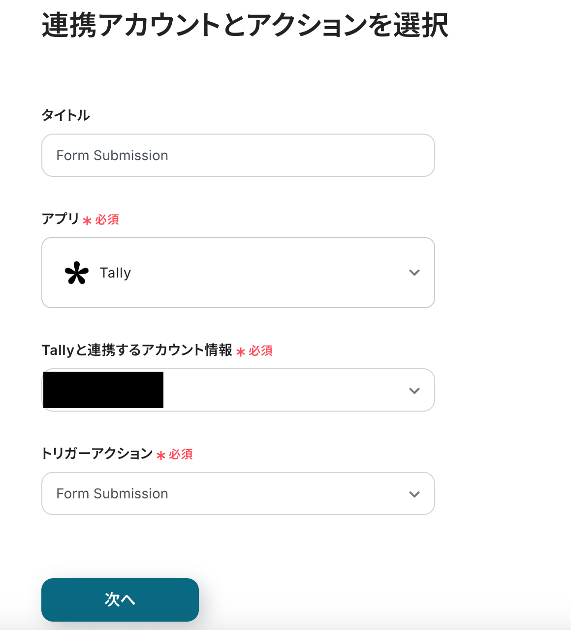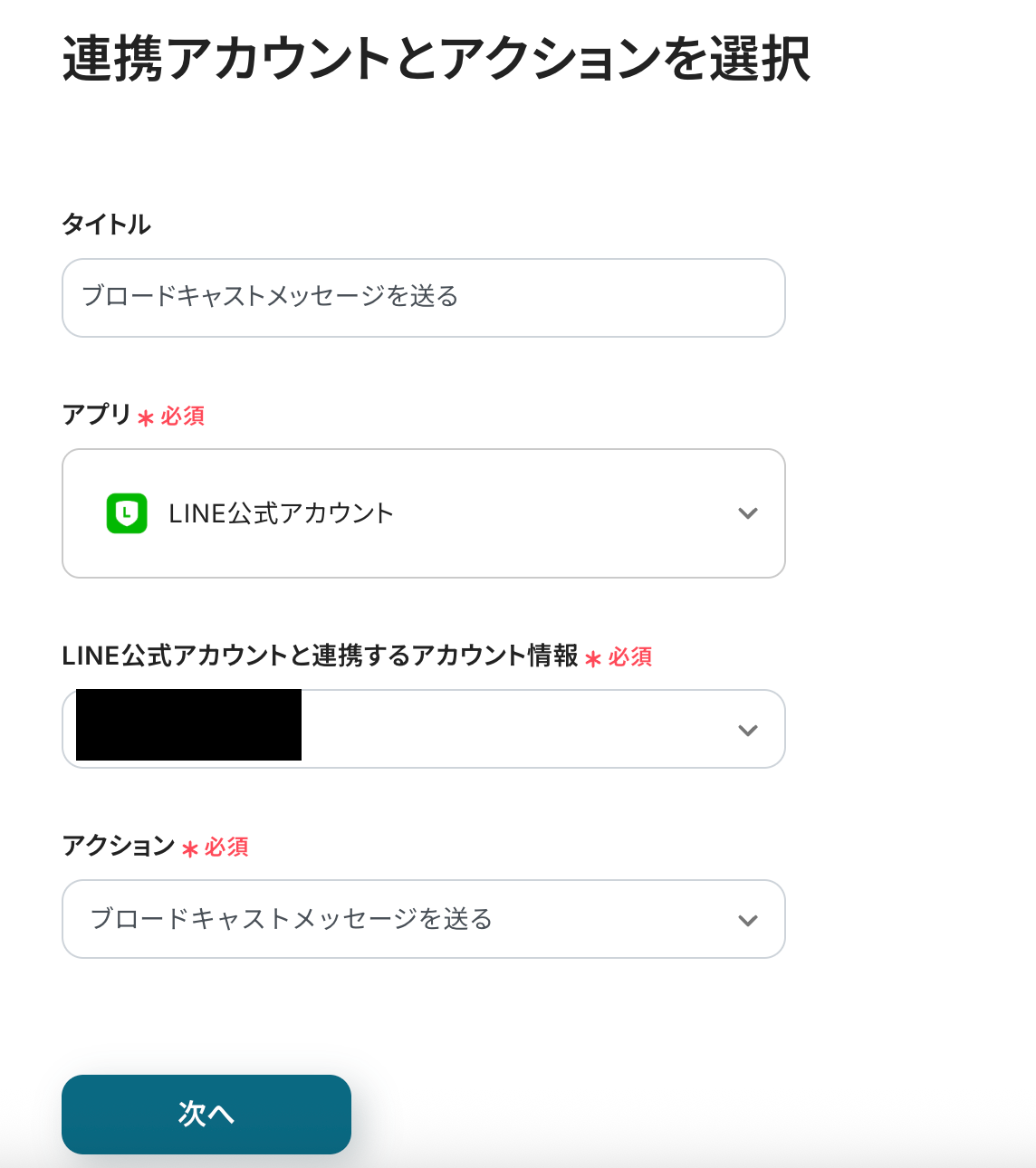 連携アカウントとアクションを選択する画面は、以下の内容を確認し、次へをクリックしましょう。