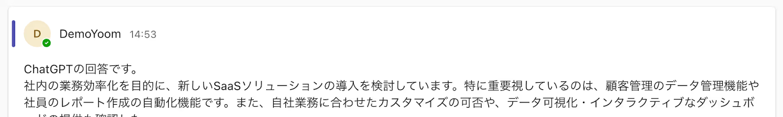 例えば、Microsoft Teamsに投稿があった際にChatGPTが自動で内容を解析し、最適な返答を返すことが可能です。