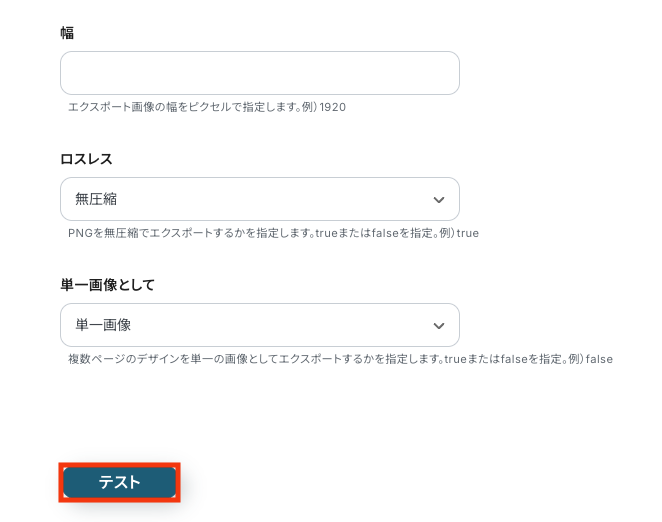 前のステップで取得した「エクスポートするジョブID」を使って、デザインのダウンロードリンクを取得します。 入力欄をクリックすると候補が表示されるので、対象の項目を選択しましょう。 入力が完了したら「テスト」をクリックします。