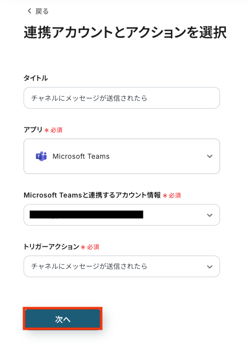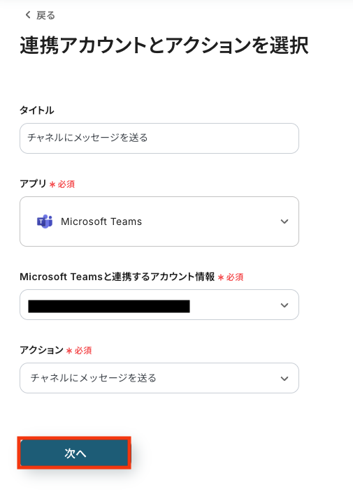 タイトルは任意で変更できます。 アプリとアクションはあらかじめ設定されているため、そのまま内容を確認してください。 Microsoft Teamsと連携するアカウント情報に問題がなければ、「次へ」をクリックします。