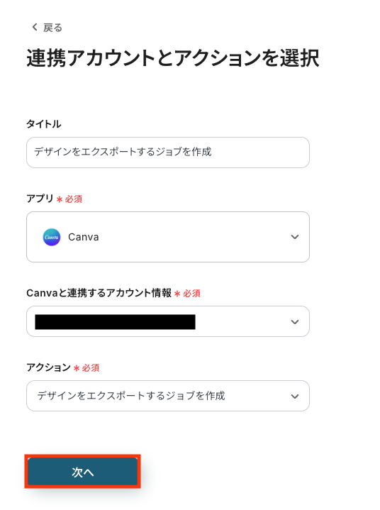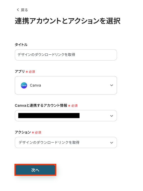 タイトルは任意で変更できます。 アプリとアクションはあらかじめ設定されているため、そのまま内容を確認してください。 Canvaと連携するアカウント情報に問題がなければ、「次へ」をクリックします。