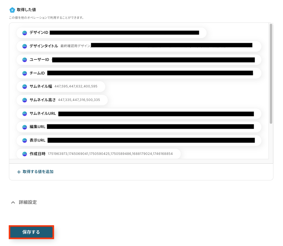 テストが成功すると、取得されたデザインファイルに関する情報が一覧で表示されます。 内容を確認し、「保存する」をクリックします。