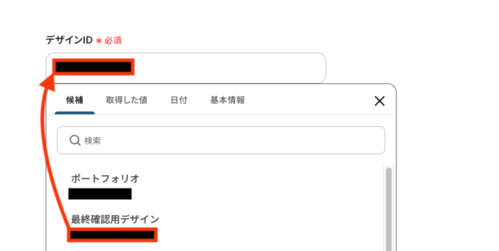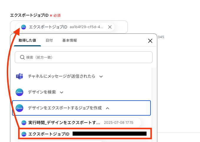 CanvaからエクスポートするデザインIDを指定します。 入力欄をクリックすると候補が表示されるので、対象の項目を選択しましょう。
