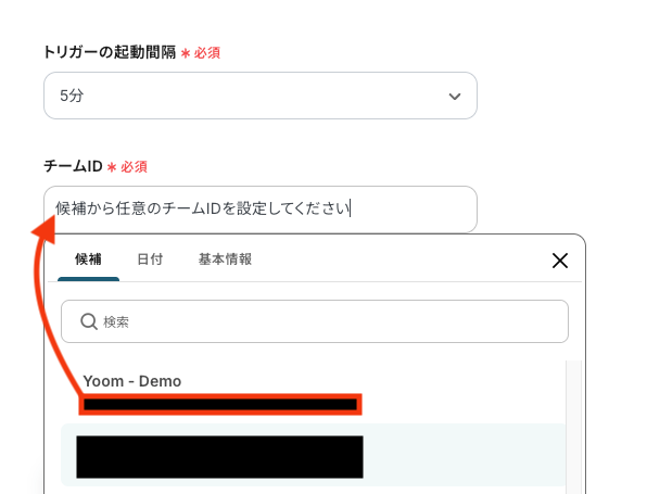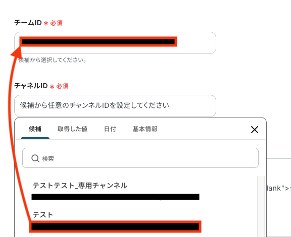 メッセージを送信したい「チームID」と「チャネルID」を設定します。 (ステップ3と同じチームでも大丈夫です。) 入力欄をクリックすると候補が表示されるので、対象のチャネルを選択しましょう。
