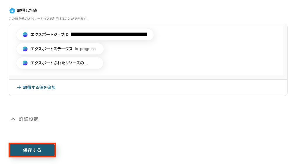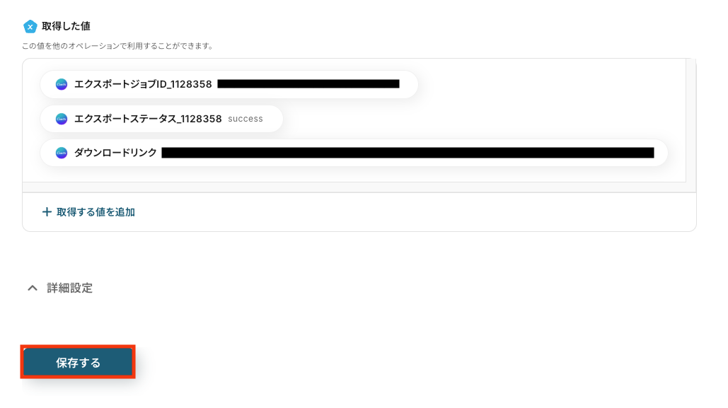 テストが成功すると、エクスポートされたファイルの情報が一覧で表示されます。 内容を確認し、「保存する」をクリックします。