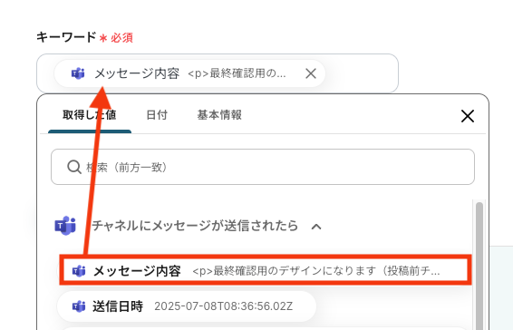 前のステップで取得したMicrosoft Teamsのメッセージ内容を「キーワード」として、Canva内のデザインを検索します。 入力欄をクリックすると候補が表示されるので、対象の項目を選択しましょう。 入力が完了したら「テスト」をクリックします。
