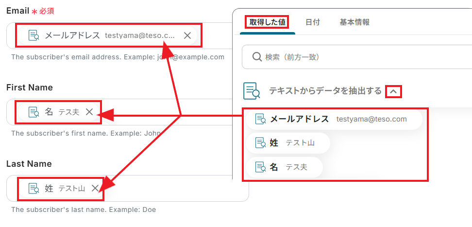 指示内容を入力できたら、「テスト」ボタンを押してみましょう。AIが指示通りに文字列をデータとして抽出したかどうか、取得した値に反映されています。