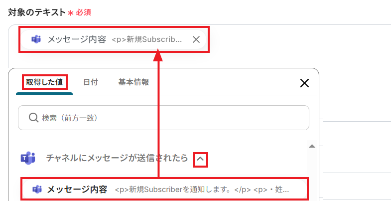 「次へ」を押して、AIがメッセージ内容を抽出する「対象のテキスト」を設定します。 ここでは取得した値から、「メッセージ内容」を選んでください。取得した値を使うことによって、Microsoft Teamsで新たに分岐条件を満たすメッセージが送信される度に、新しいメッセージ内容が反映されていきます。