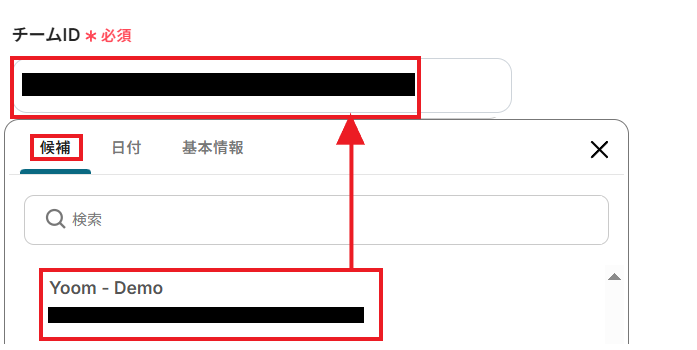 「チームID」のボックスをクリックすると、連携しているMicrosoft Teamsのアカウントから候補が表示されるため、任意のものを選択してください。
