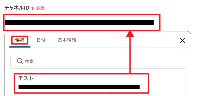 「チャネルID」も同様に、候補から任意のチャネルをクリックしましょう。