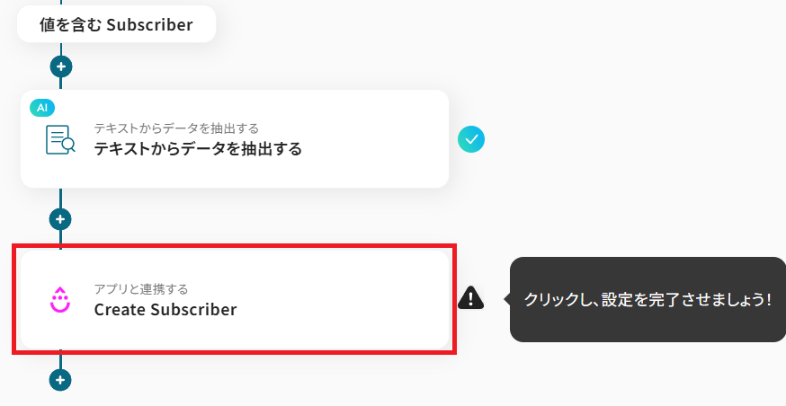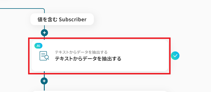 前ステップで設定した分岐条件である、「メッセージに特定の文字(Subscriber)を含む」場合のみ、後続のアクションに進みます。 「Subscriber」と書かれたメッセージから、Dripに連携するための情報を抽出するアクションを設定していきましょう。