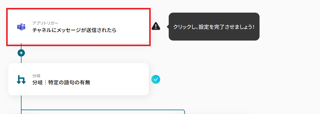 Yoomのフローボットを動かす引き金となるアクションのことを「アプリトリガー」と呼びます。 このフローボットでトリガーになっている、Microsoft Teamsの「チャネルにメッセージが送信されたら」というアクションを設定していきましょう。