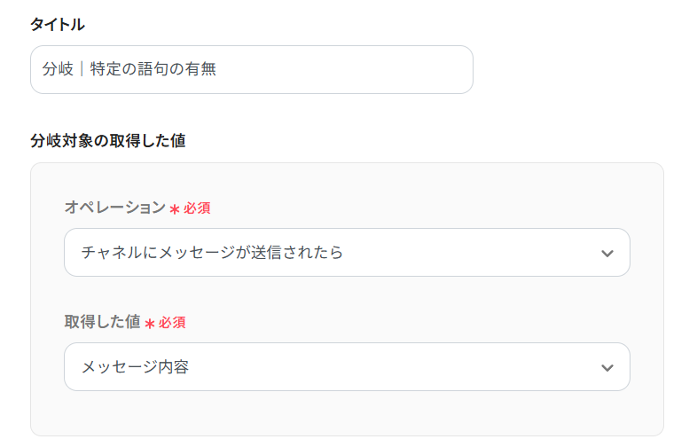 タイトルは任意で設定し、「分岐対象の取得した値」を設定していきましょう。 分岐の条件となる対象の値として、ここではMicrosoft Teamsに送信された「メッセージ内容」を設定しています。