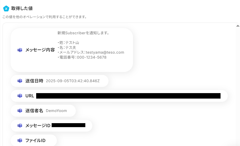Microsoft Teamsの該当チャネルにテストメッセージを送信できたら、Yoomの設定画面に戻って「テスト」ボタンを押してみましょう。 「取得した値」に、Microsoft Teamsで送信されたテストメッセージの内容が反映されていれば成功です!