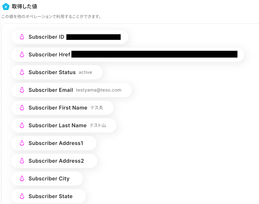 他にもアウトプットから設定できる項目があれば、必要に応じて設定してください。 必要な設定を終えたら、「テスト」ボタンを押してみましょう。取得した値に、Dripで作成されたSubscriberの内容が反映されていれば成功です!
