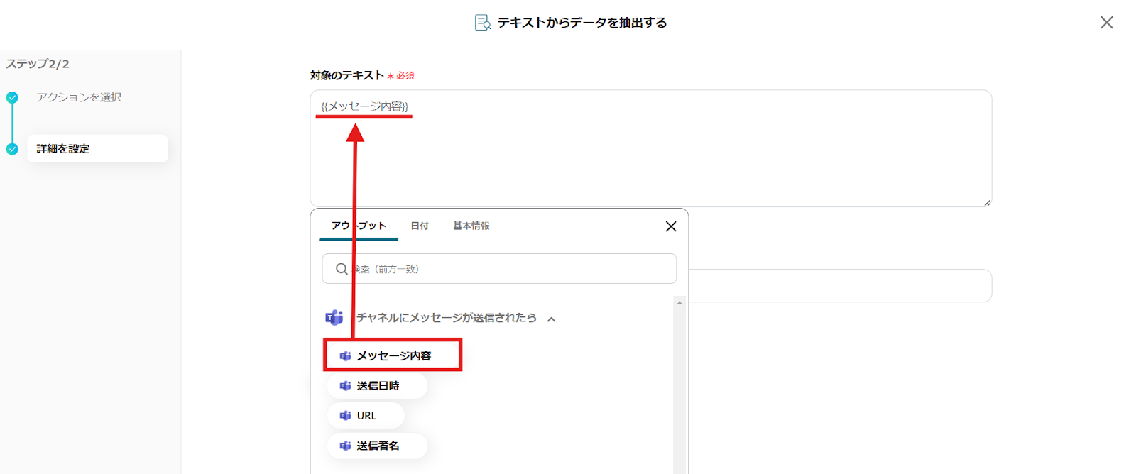 まず、Microsoft Teamsの特定のチャネルに投稿されたメッセージの内容から、指定した文字列をAIの抽出機能でピックアップします。