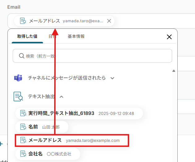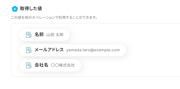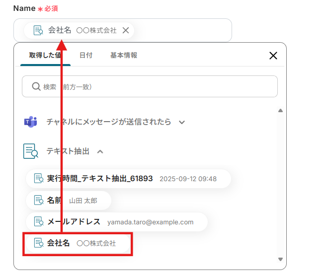 Nameには以下のように取得した値から「会社名」をクリック し入力しましょう。