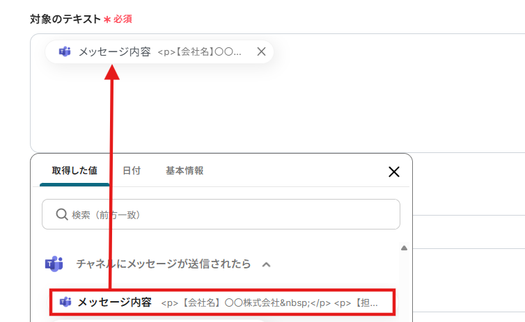 対象のテキストには以下のように、Microsoft Teamsから取得した値より「メッセージ内容」を選択しましょう。