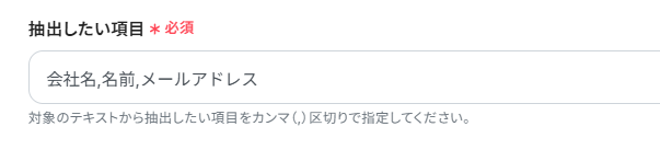 抽出したい項目には以下に入力します。必要に応じて変更することも可能です。 今回はCloseに会社名、名前、メールアドレスを登録したいため、以下のように設定しました。