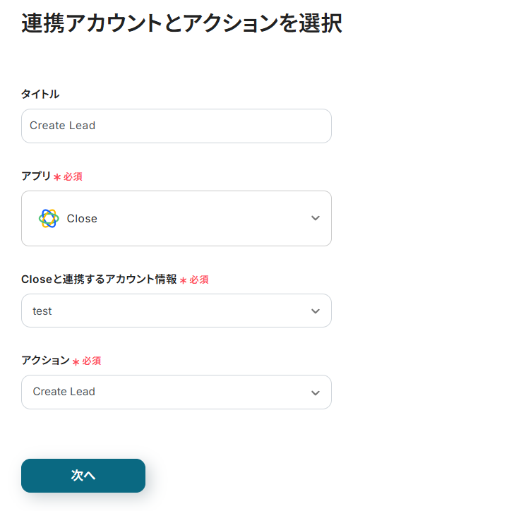 連携アカウントとアクションを選択する画面が表示されるので、今回連携するCloseのアカウントを確認し「次へ」をクリックします。