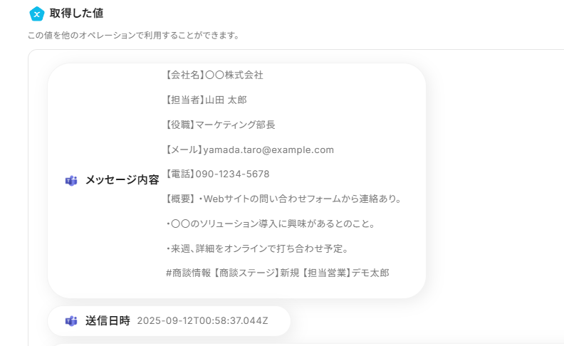 設定ができたら連携テストを行います。まずはMicrosoft Teamsの指定したチャネルに、会社名や名前、メールアドレスなど、Closeに連携したい内容を含んだメッセージを送信しましょう。その後テストボタンをクリックします。 テストが成功すると、取得した値 が表示され、Microsoft Teamsのデータが確認できます。「保存する」をクリックして完了です!