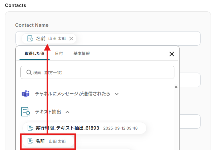 Contactsの入力を進めます。 Contact Nameは取得した値から「名前」 を選択しましょう。