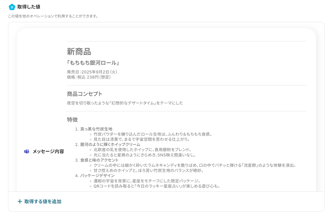 「取得した値=アウトプット」として、Microsoft Teamsに送ったメッセージを反映した以下の内容が表示されていれば成功です!