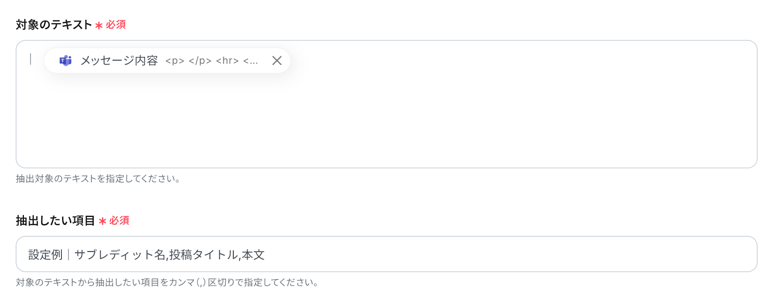 なお、テキストを直接入力した部分は固定値とされるため、アウトプットを活用せず設定を行うと毎回同じMicrosoft Teamsのデータからのみワードが抽出されてしまうので注意が必要です。