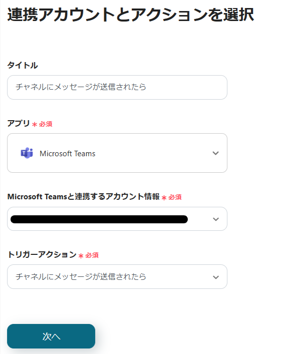最初の設定は「チャネルのメッセージが送信されたら」です。