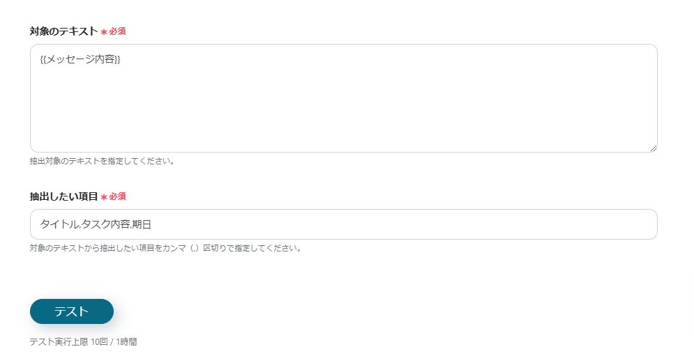 タイトル、期日、説明などにアウトプットを選択したら「テスト」をクリックしてください。