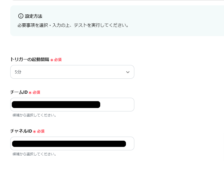 チームIDとチャネルIDを候補から選択したら、指定したMicrosoft Teamsのチャネルにテスト用のメッセージを投稿してから「テスト」をクリックしてください。